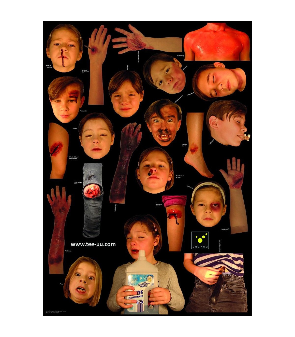 Compuesto por 24 elementos laminados que representan diferentes tipos de lesiones, este kit ofrece una gran variedad de escenarios pedagógicos adaptados a las intervenciones con niños.