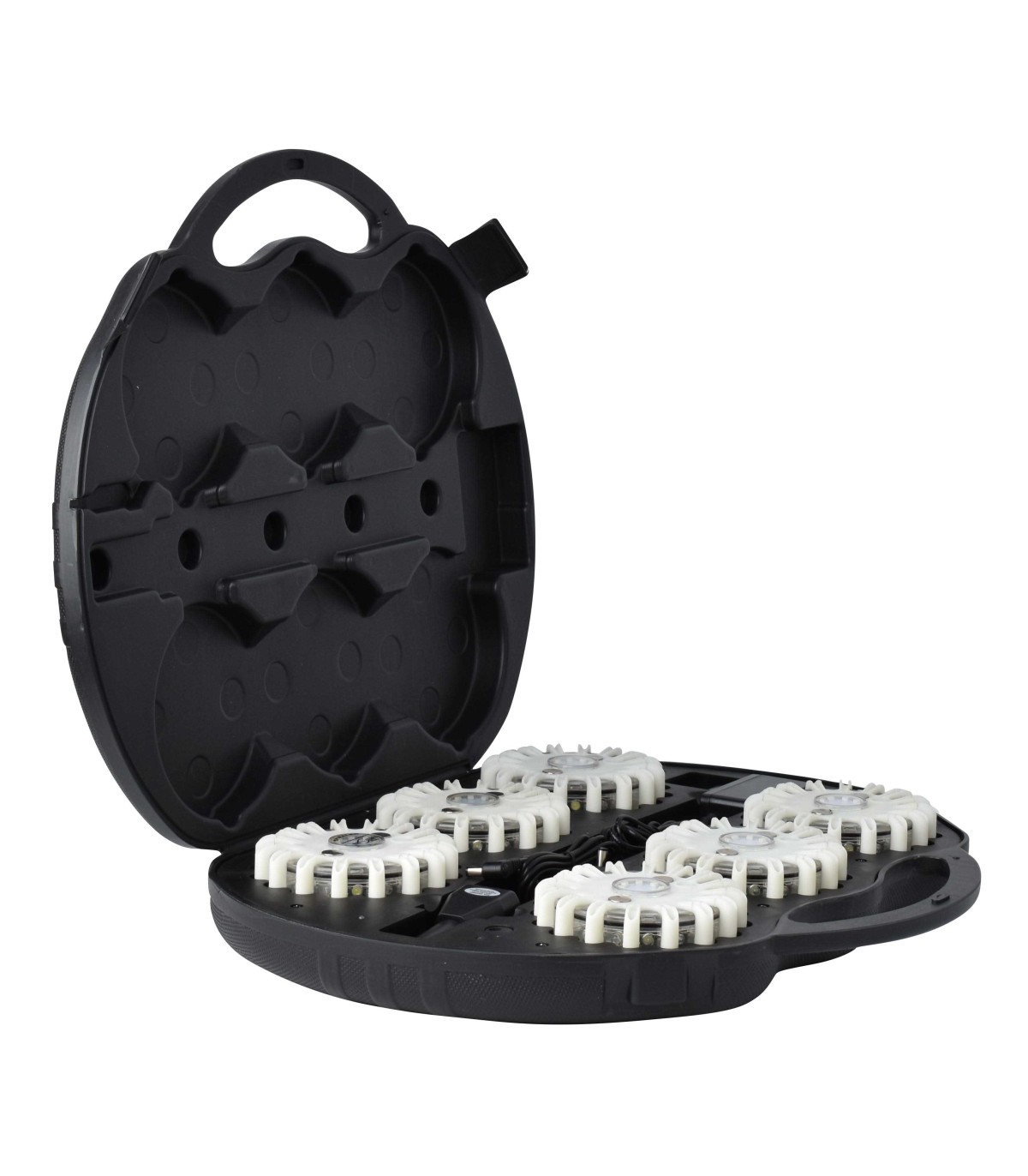 Valise compacte contenant 6 balises LED de couleurs identiques (orange, bleu, rouge, vert, blanc, jaune), avec 9 modes de clignotement, diffusion à 360°, étanchéité totale et recharge via secteur ou prise allume-cigare. Autonomie d’environ 50 heures, idéale pour signalisation d’intervention, zone sinistrée ou balisage de chantiers.